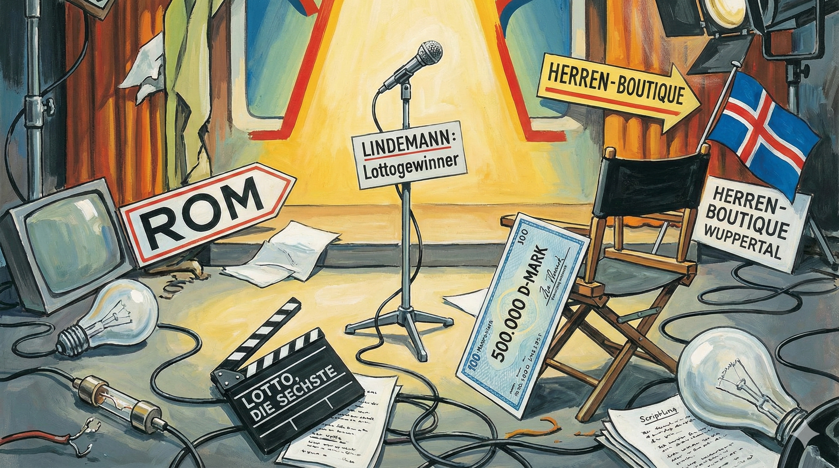 LINDEMANN: Ich … heiße … Erwin … Lindemann, bin Rentner und 66 Jahre … mit meinem Lottogewinn von 500.000 D-Mark mache ich erst mal eine Reise nach Island … dann fahre ich mit meiner Tochter nach Rom und besuche eine Papstaudienz … und im Herbst eröffne ich dann in Wuppertal eine Herren-Boutique.