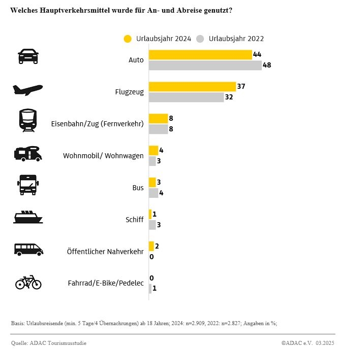 Nachhaltigkeit scheint nicht mehr gefragt zu sein: Nachdem es in der Pandemiezeit zu einem Einbruch gekommen war, hat sich das Reiseverhalten der Deutschen im Jahr 2024 stabilisiert. Das Auto wird weiterhin am häufigsten genutzt und die Zahl der Flüge ist im Vergleich zu 2022 um 5 Prozent gestiegen. Unverändert 8 Prozent der Urlauber nutzten die Bahn und weniger als ein Prozent das Fahrrad. 03.03.2025 https://www.adac.de/verkehr/standpunkte-studien/mobilitaets-trends/tourismusstudie-reisen/